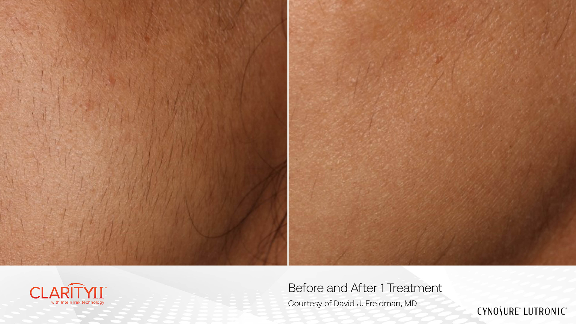 Clarity II laser hair removal uses dual wavelengths—755 nm and 1064 nm—to disrupt hair growth by delivering concentrated light energy directly to the follicle. When the laser pulse reaches the skin, it targets melanin, the pigment found in the hair shaft and root. The pigment absorbs the light and transforms it into heat, which impairs the follicle so it can no longer grow hair effectively.